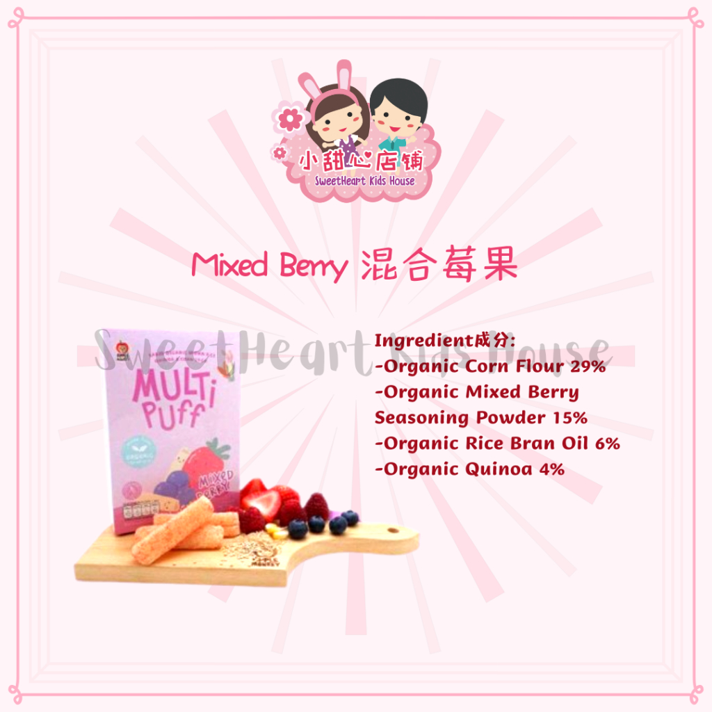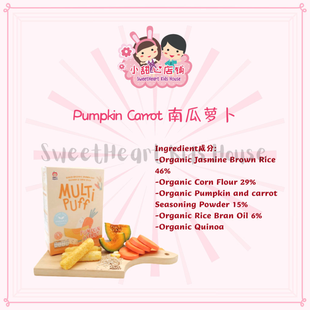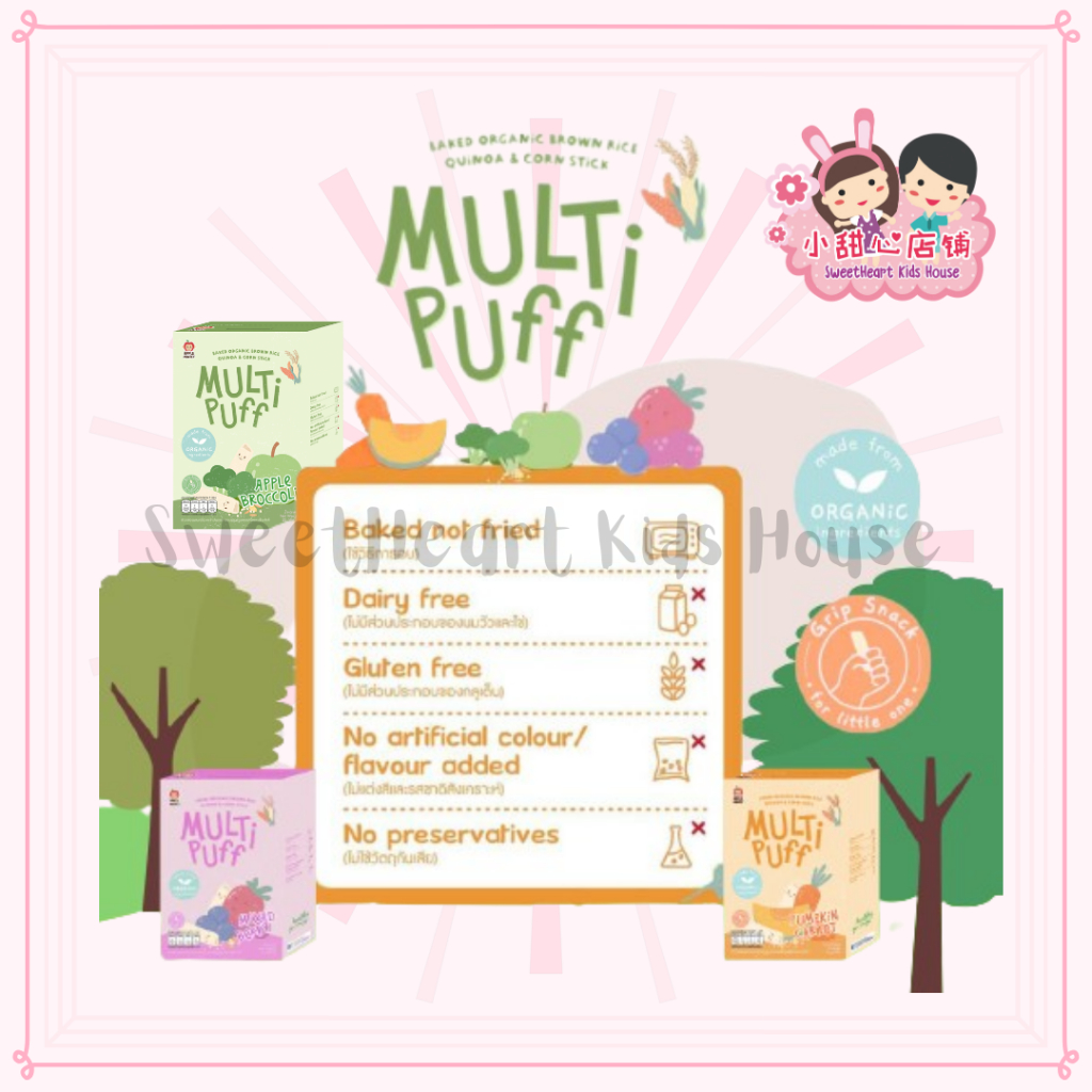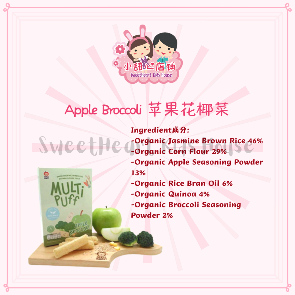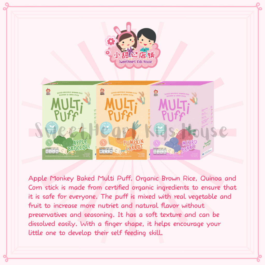 Apple Monkey Baked Multi Puff Organic Brown Rice, Quinoa, and Corn Stick is made from certified organic ingredients to ensure that it is safe for everyone. The Puff is mixed with real vegetable and fruit to increase more nutrient and natural flavor without preservatives and seasoning. It has a soft texture and can be dissolved easily. With a finger shape, it helps encourage your little one to develop their self-feeding skill.