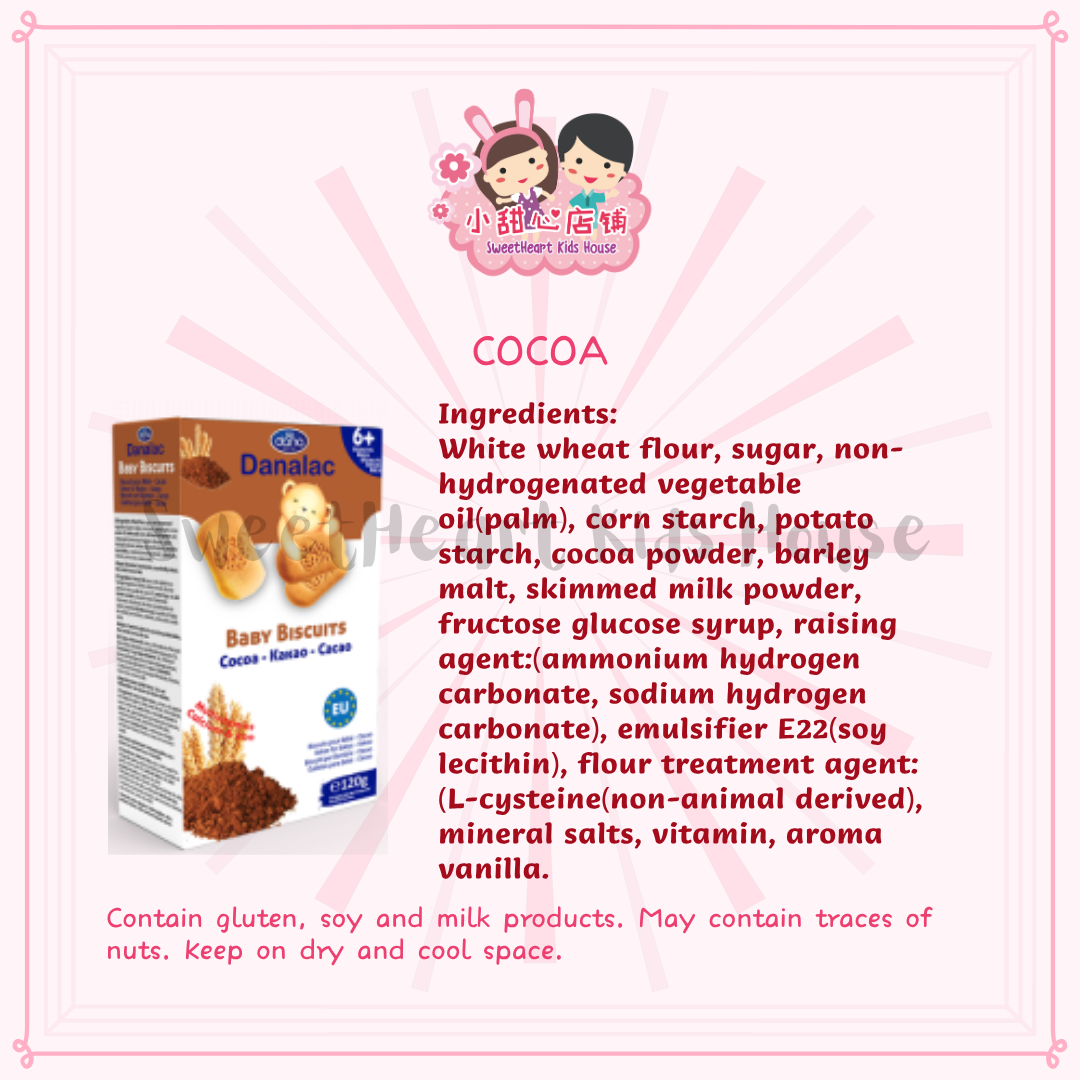 Wheat Flour, Sugar, Non-hydrogenated vegetable oil ( palm & olive ), Corn Starch, Potato Starch, Cocoa Powder 2%, Barley Malt, Honey, Skimmed Milk Powder, Salt, Raising Agents (ammonium hydrogen carbonate, sodium hydrogen carbonate, sodium acid pyrophosphate), Emulsifier (soy lecithin), L-Cysteine (non-animal derived), Mineral Salts, Vitamins, Aroma Cream, Aroma Vanilla