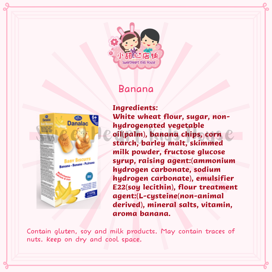 Wheat Flour, Sugar, Non-hydrogenated vegetable oil ( palm ), Banana Chips 4.5%, Corn Starch, Barley Malt, Skimmed Milk Powder, Fructose Glucose Syrup, Raising Agents (ammonium hydrogen carbonate, sodium hydrogen carbonate, sodium acid pyrophosphate), Salt, Emulsifier (soy lecithin), L-Cysteine (non-animal derived), Vitamins, Aroma Banana