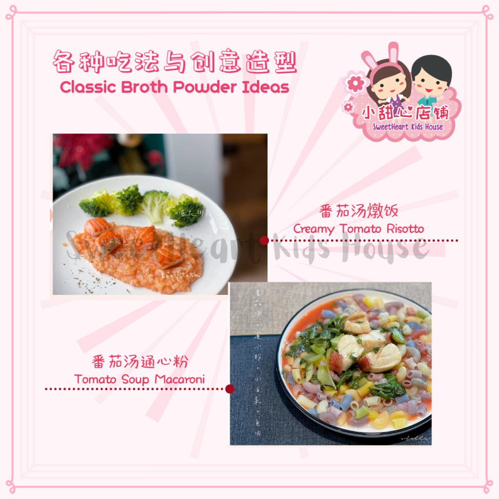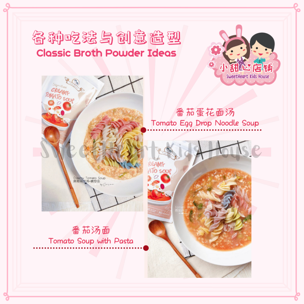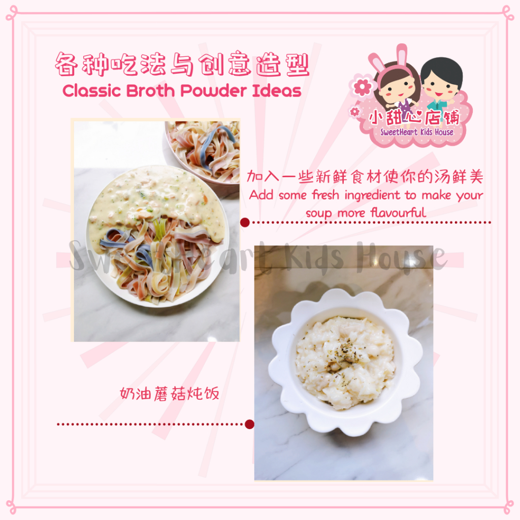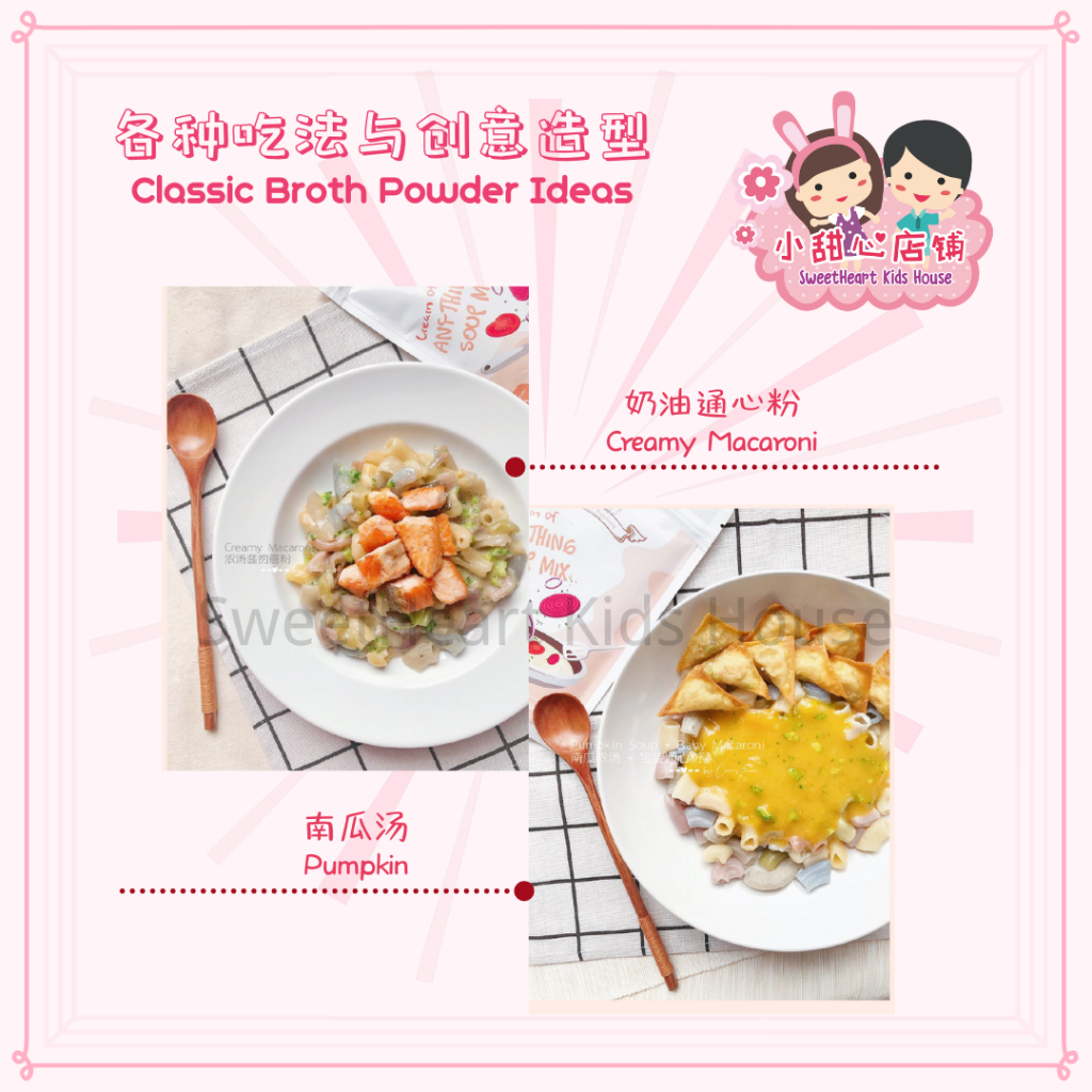 DOUBLE HAPPINESS 食品生产专为儿童创立的独家西式浓汤预拌粉 ,适合搭配蔬菜 / 肉类 或其他食材在浓汤内当作汤底 .