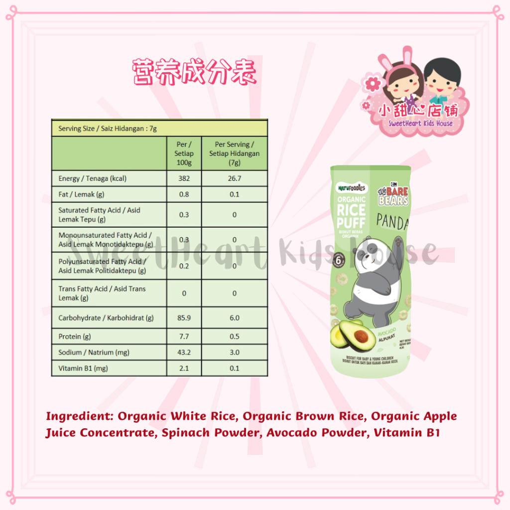 Organic White Rice, Organic Brown Rice, Organic Apple Juice Concentrate, Spinach Powder, Avocado Powder, Vitamin B1
