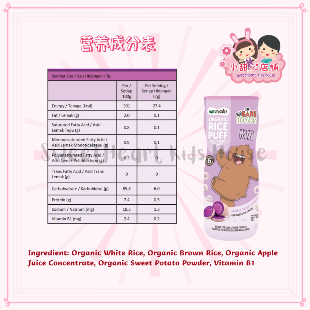 Organic White Rice, Organic Brown Rice, Organic Apple Juice Concentrate, Organic Purple Sweet Potato Powder, Vitamin B1