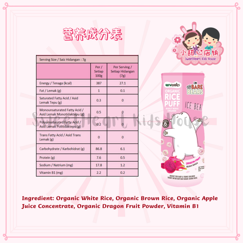 Organic White Rice, Organic Brown Rice, Organic Apple Juice Concentrate, Organic Dragon Fruit Powder, Vitamin B1