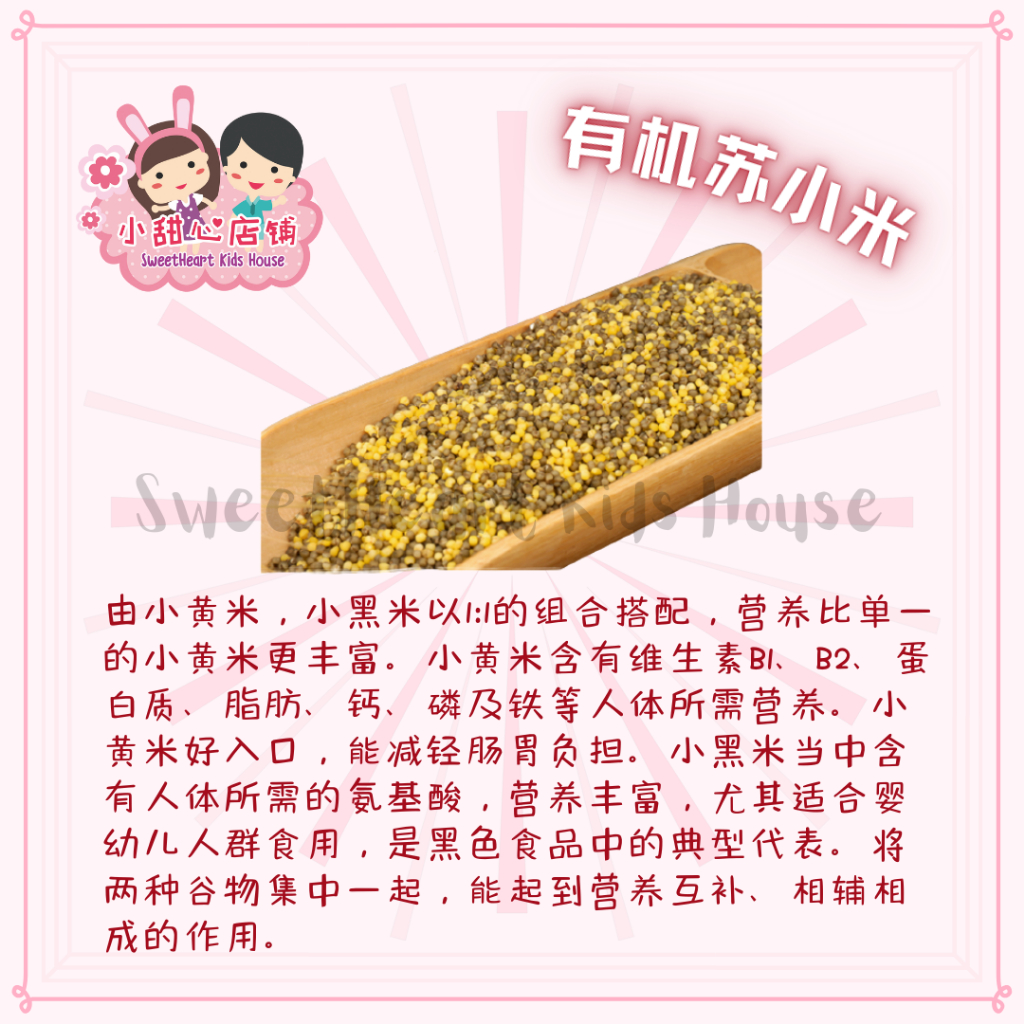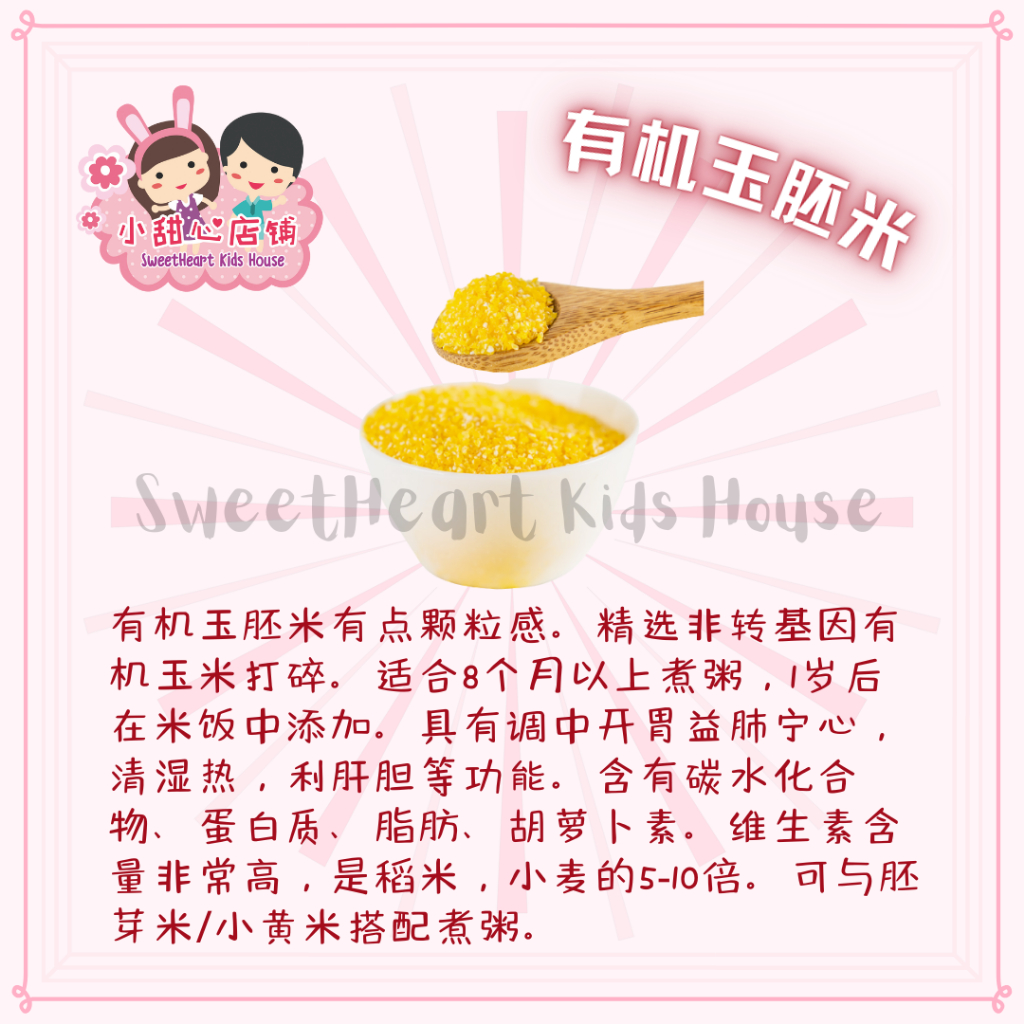 有机玉胚仔(480克):有点颗粒感。精选非转基因有机玉米打碎。适合8个月以上煮粥,1岁后在米饭后添加。具有调中开胃益肺宁心,清湿热,利肝胆等功能。含有碳水化合物、蛋白质、脂肪、胡萝卜素。维生素含量非常高,是稻米、小麦的5-10倍。 可以胚芽米/小黄米搭配煮粥