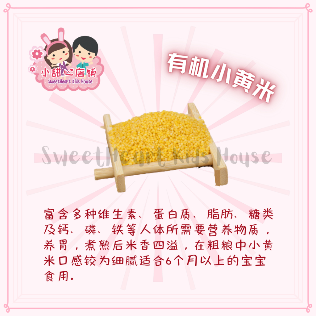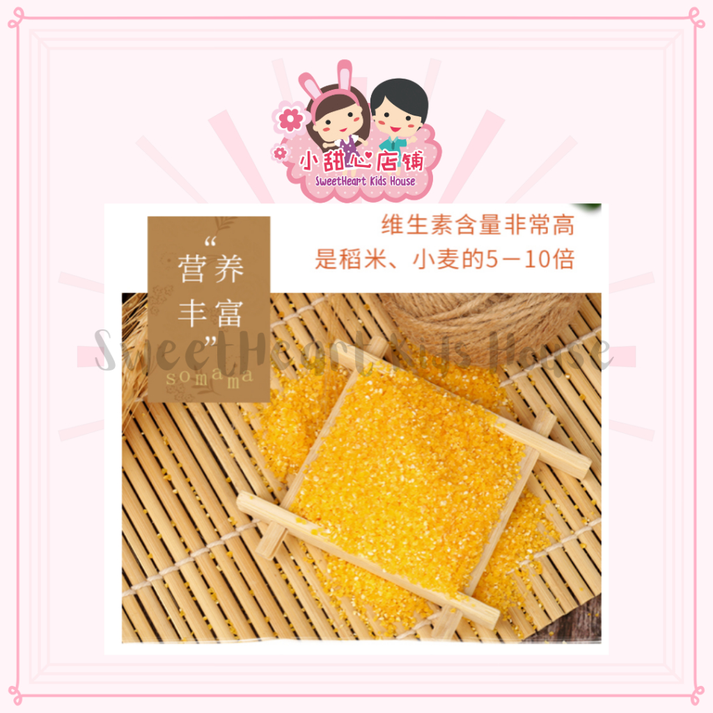 a little grainy. Selected non-GMO organic corn crushed. Suitable for cooking porridge over 8 months old, add after rice after 1 year old. It has the functions of regulating the middle and appetizing stomach, benefiting the lungs and calming the heart, clearing dampness and heat, promoting liver and gallbladder. Contains carbohydrates, protein, fat, carotene. The vitamin content is very high, 5-10 times that of rice and wheat. Can be used with germ rice/small yellow rice for porridge