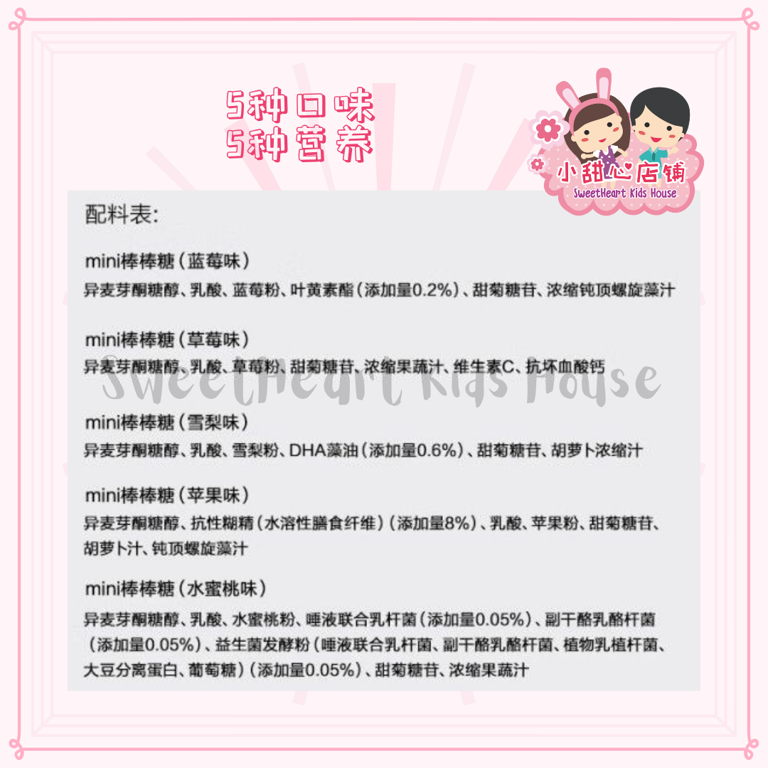 √ 草莓味 : 异麦芽酮糖醇、草莓粉、乳酸、甜菊糖苷、维生素c、浓缩果蔬汁