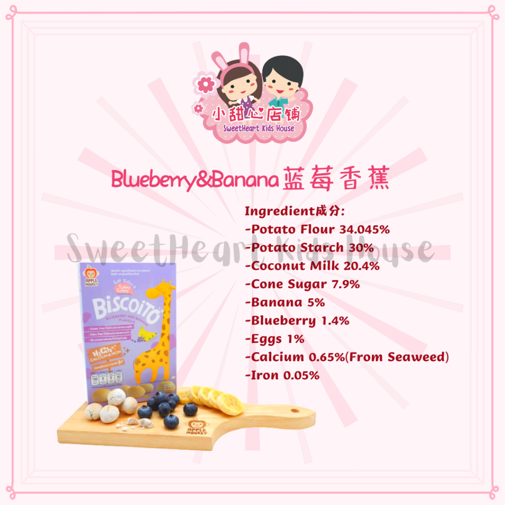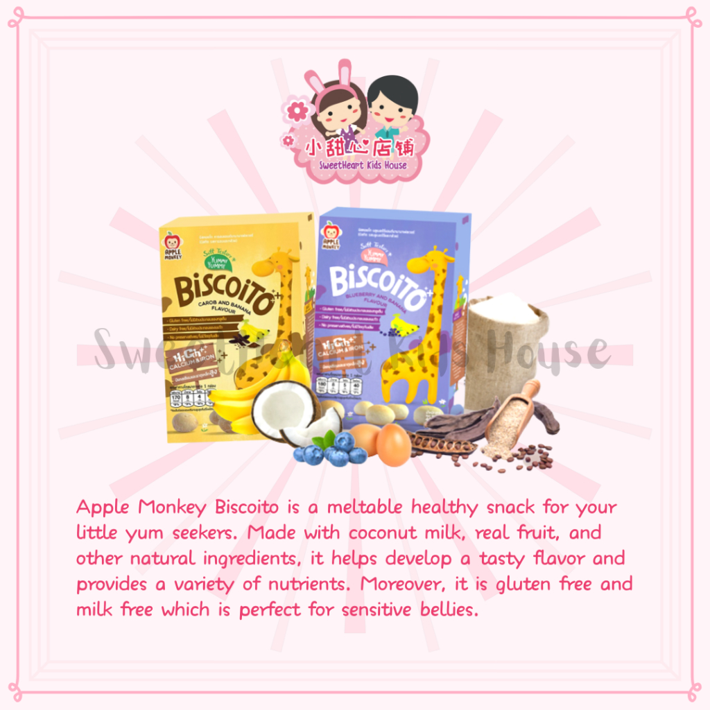 Apple Monkey Biscoito is a meltable healthy snack for your yum seekers! It made with coconut milk, real fruit,and other natural ingredients. It will helps develop a tasty flavour and provides a variety of nutrients.