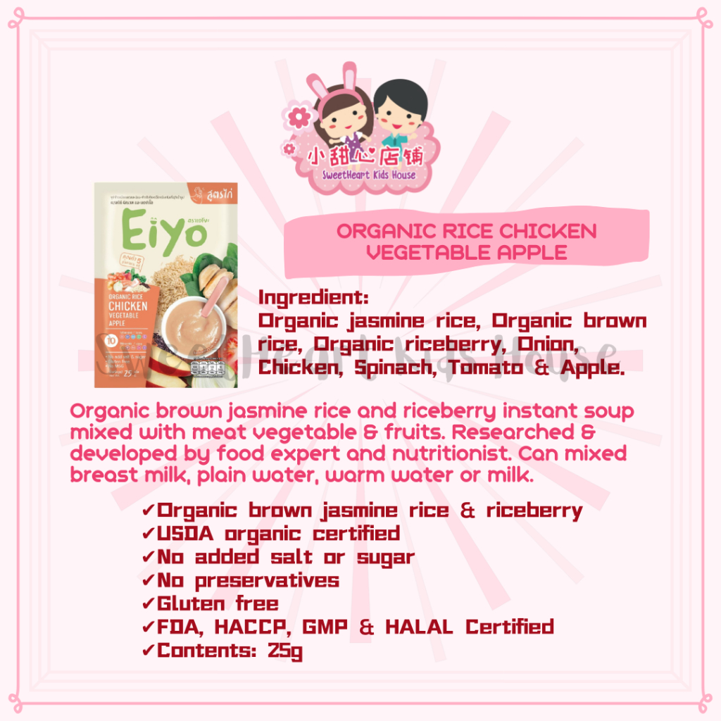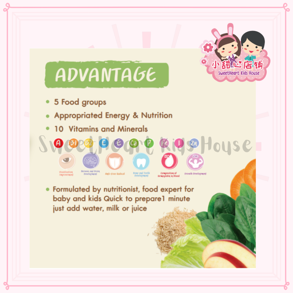 Ingradients : from 5 food groups (Organic Rice, Meat, Vegetable, Fruit, 10 Vitamins & Minerals)