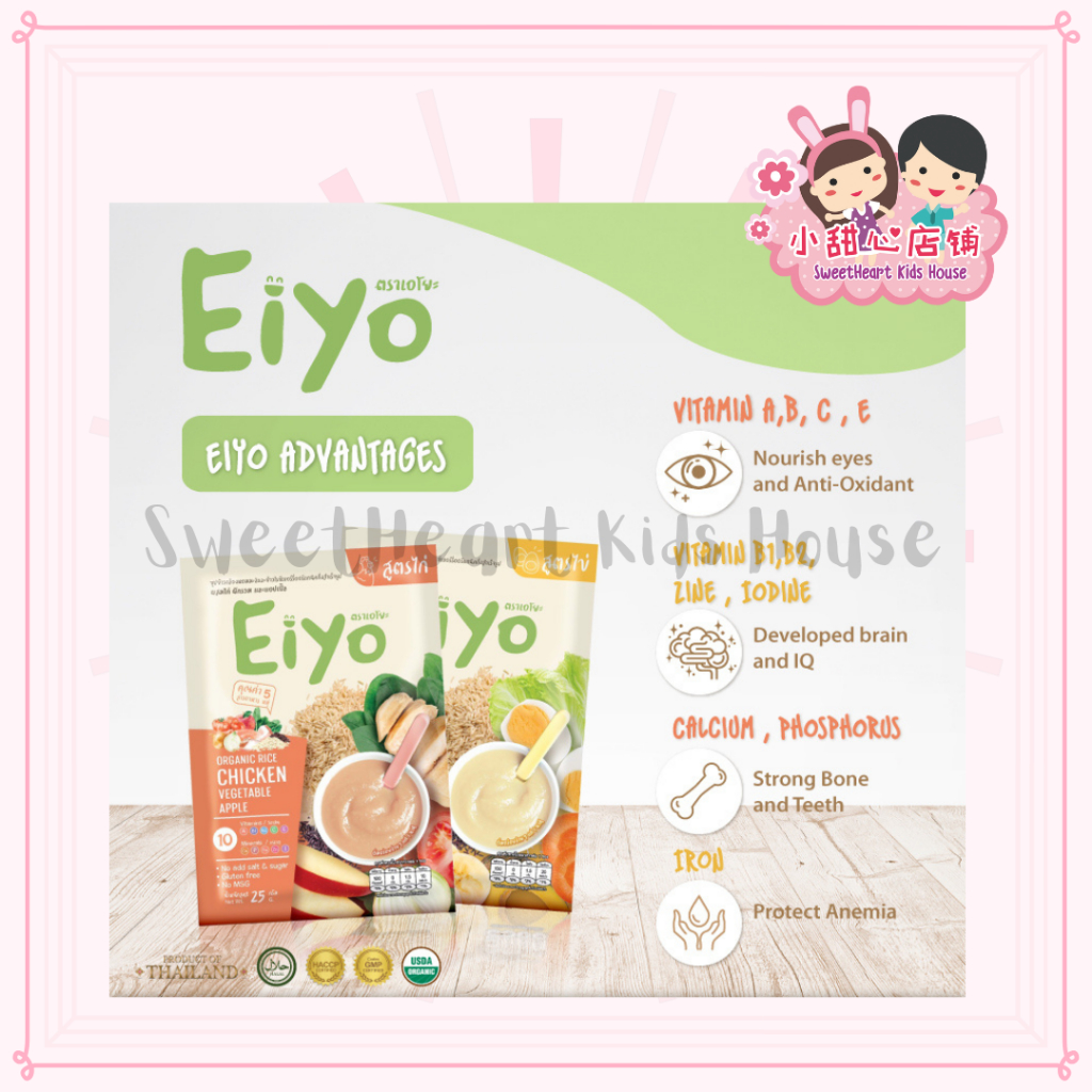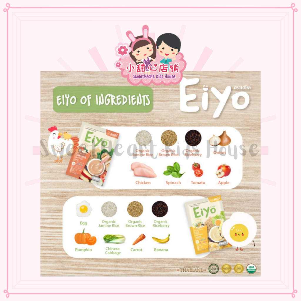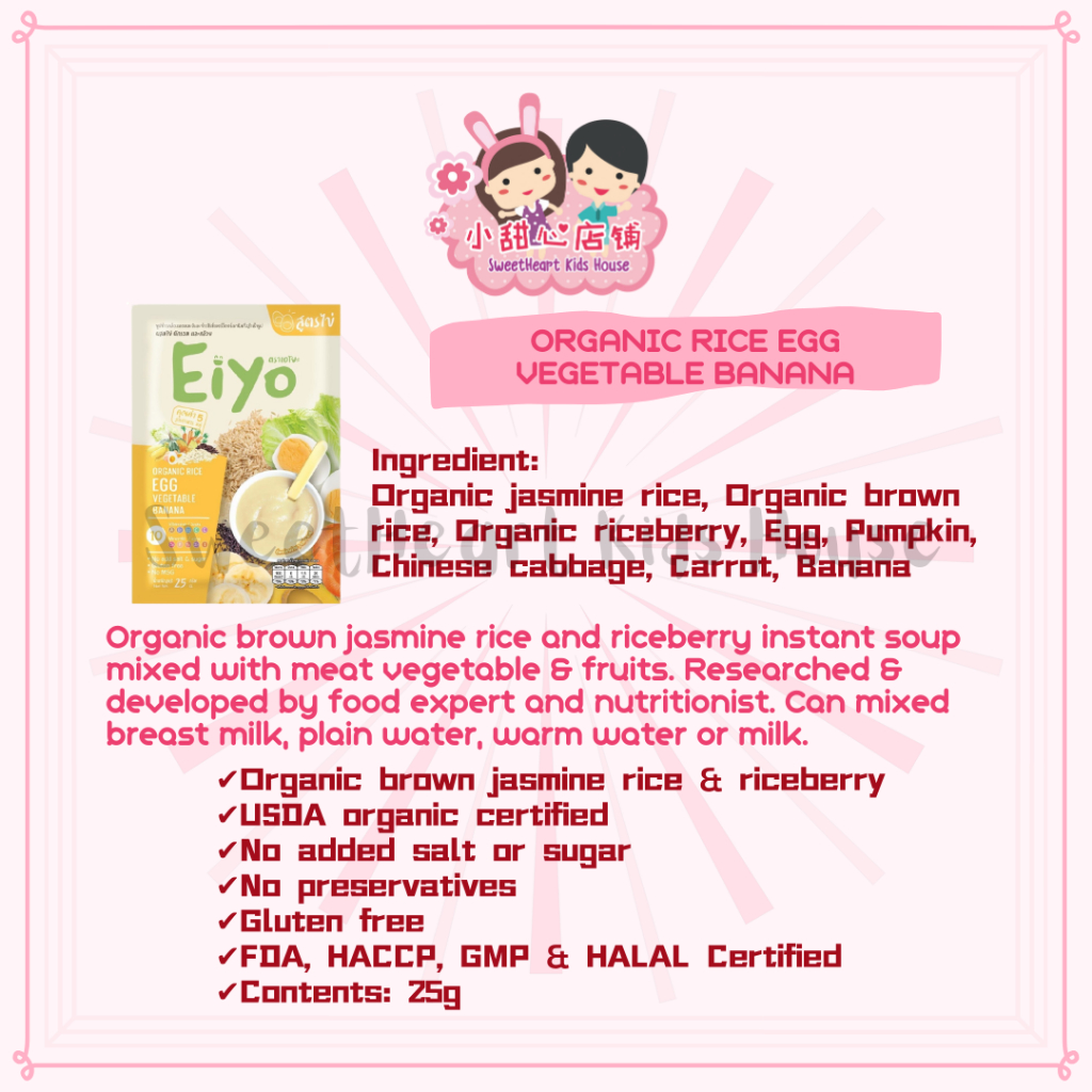 Egg formular : Organic brown rice, organic jamine rice, organic riceberry, egg, carrot, pumpkin, chinese cabbage, banana