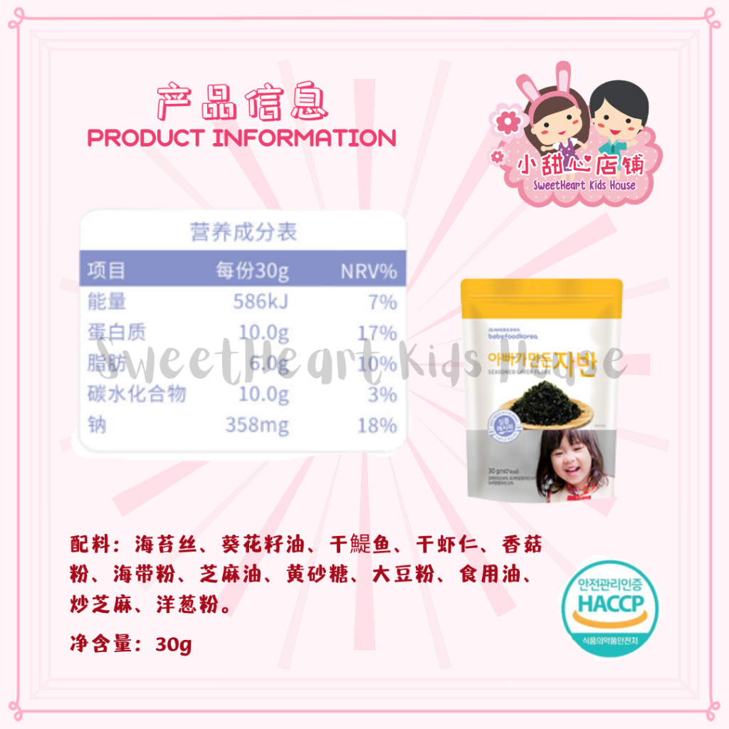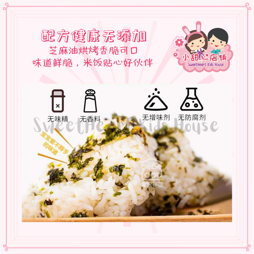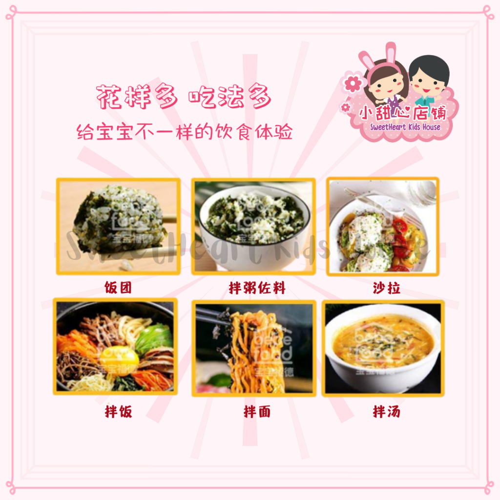 🔹是专为宝宝们研发配制的,比起我们大人吃的来的少油,低钠,宝宝可以放心地吃。有时麻麻来不及准备食物,海苔丝就可以派得上用场,简简单单的撒点在饭上就可以吃了。麻麻我自己有时忙起来,也配配饭吃,非常方便!