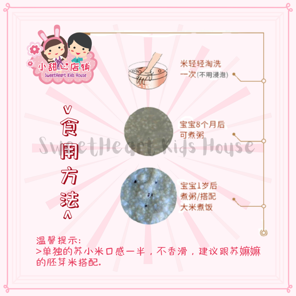 8个月以上煮粥,1岁后煮粥/搭配大米煮饭。 由小黄米,小黑米以1:1的组合搭配,营养软单一的小黄米更丰富。小黄米含有多种维生素蛋白质、脂肪、糖类及钙、磷、铁等人体所必需营养。小黑米当中的钙、磷、铁消化吸收率高达97.4%。